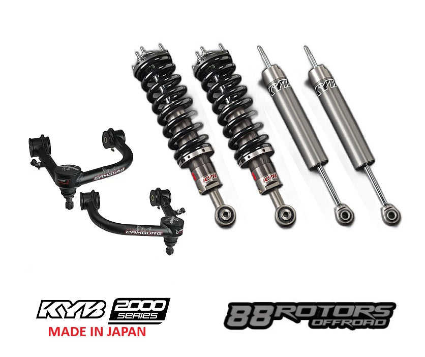 Optional add ons: • Front Elevate Chromoly Upper Control Arms w/ Caps • Front Camburg Tubular XL X-Joint Upper Control Arms • Front Camburg Kinetik Billet Uniball Upper Control Arms • Rear Pair of Old Man Emu 1.5" Lift Springs KYB 2000 SERIES SHOCKS ARE MADE IN JAPAN